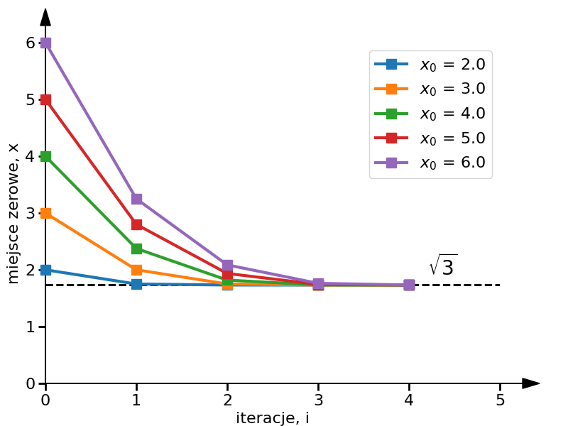 Wraz z kolejnymi iteracjami dostajemy coraz lepsze oszacowanie, które wynosi $\sqrt{3} = 1.732050807568872...$. Nawet gdy nasz punkt startowy będzie daleko od dokładnej wartości metoda Newtona bardzo szybko będzie zbiegać do poprawnej wartości. Mówimy że metoda ta ma kwadratową zbieżność. Zestawmy otrzymane wyniki w tabeli