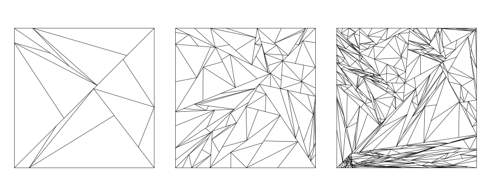 Wymagania: Python, Matplotlib. Algortym wykorzystuje rekurencję do dzielenia trójkątów na mniejsze trójkąty. Zaczynamy od dwóch trójkątów które tworzą kwadrat. Pogram losuje wierzchołek z którego wyprowadzany jest odcienek łączącyu losowy punkt na przeciwległym boku. Nowoutworzony odcinek stanowi nową krawędź powstałych trójkątów.