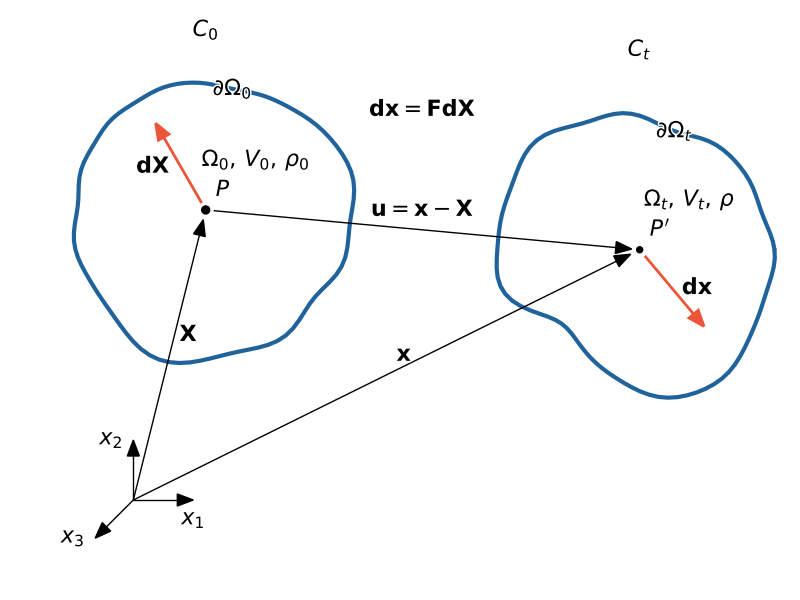 We distinguish two configurations - the initial configuration $C_0$ and the current configuration $C_t$. The body occupies a specific region at any moment of time $\Omega$. The body has it own volume $V$ and density $\rho$. $\X$ - represents the initial or reference position of the material point, whereas - $\x$ - represents its the current or deformed position. The displacement vector $\u$ represents the change in position of a material point within a deformable body as it undergoes deformation. The deformation gradient $\F$ describes how material element $\d\X$ within a deformable body have changed from their original (inital) configuration to their current deformed state $\d\x$.
