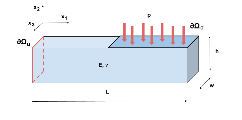 $$\u(\x) = \hat{\u}(\x) = 0, \quad \x \in \partial\Omega_u$$ $$\ss\n(\x) = \hat{\t}(\x) = p \I \e_2 = p \e_2, \quad \x \in \partial\Omega_{\sigma}$$