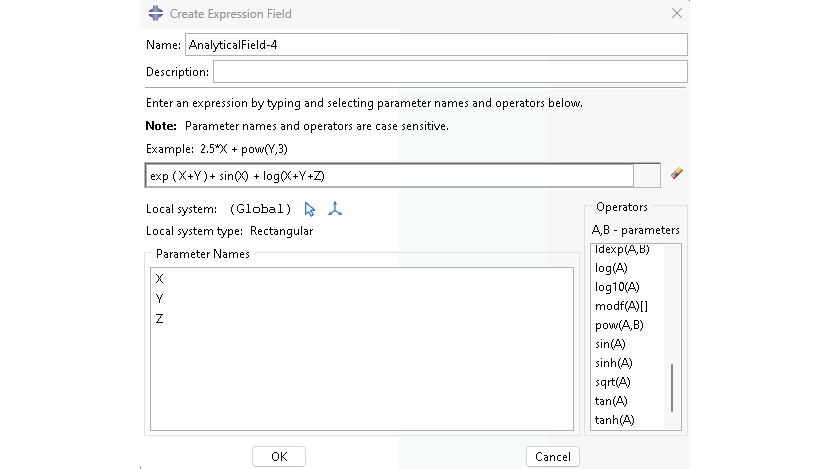 The Analytical Field toolset allows you to create and manage analytical fields. Analytical fields defined using mathematical expressions are called expression fields. Analytical fields indicate points in space using coordinates of the global coordinate system or of a local coordinate system.
