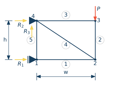$$\begin{array}{ccccccccc} 4x_1 & + & 2x_2 & + & 3x_3 & + & 7x_4 &=& 3\\ 8x_1 & + & 9x_2 & + & x_3 & - & 2x_4 &=& 8\\ x_1 & - & 2x_2 & + & 7x_3 & - & 5x_4 &=& -3\\ -2x_1 & - & 5x_2 & + & 6x_3 & - & 8x_4& =& -2\\ \end{array}$$Zbuduj układ równań liniowych dla podanej kratownicy korzystając z metody równoważenia węzłów. Następnie rozwiąż układ i wyświetl siły w każdym pręcie kratownicy