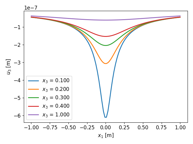 Rozwiązanie zagadnienia Boussinesqa dla różnych wartości głębokości $x_3$.
