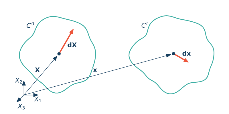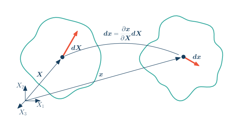 Wybierzmy dwa włókna materialne $d\X_1$ i $d\X_{2}$ w konfiguracji odniesienia oraz ich transformację w konfiguracji aktualnej $d\x_{1}$ i $\mathrm{d}\x_{2}$ tak aby