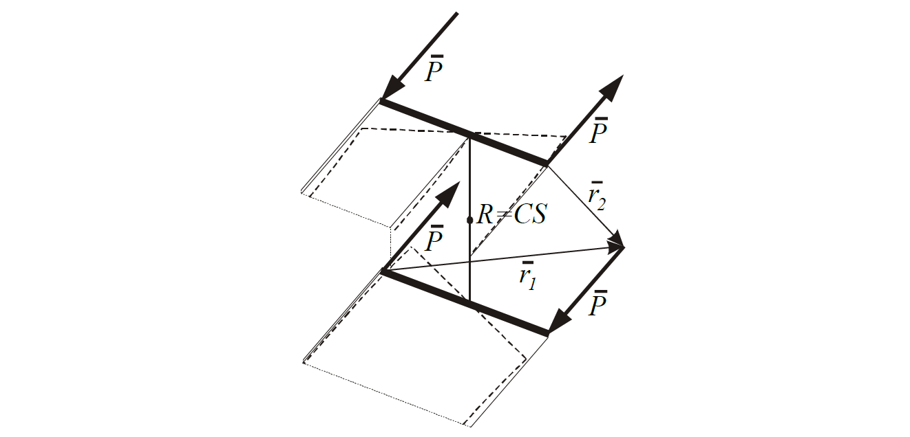 $$B_{\omega} = P \omega(s_P)$$Ze wzoru tego obliczymy bimoment, która pojawi się po zredukowaniu do bieguna $R$ siły $P$ przyłożonej w punkcie o współrzędnej wycinkowej $\omega(s_P)$. Istnienie bipary i bimomentu powoduje pojawienie się nowej definicji równoważności układów sił. W przypadku prętów cienkościennych mamy do czynienia z tzw. kinematyczną równoważnością układów sił zewnętrznych i wewnętrznych.