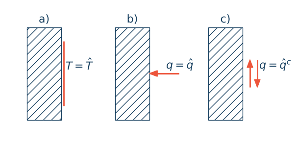 Warunki brzegowe dla zagadnienia przepływu ciepła. a) Zadana temperatura na brzegu, b) zadany strumień ciepła, c) zadana konwekcja.