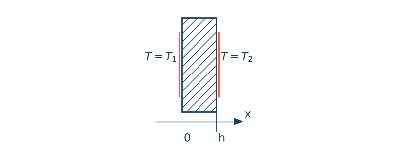 Zapisz i rozwiąż równanie różniczkowe opisujące jednowymiarowy przepływ ciepłą dla materiału jednorodnego. Przepływ jest ustalony, brak jest wewnętrznych źródeł ciepła. Warunki brzegowe zdefiniowane są zgodnie z rysunkiem.