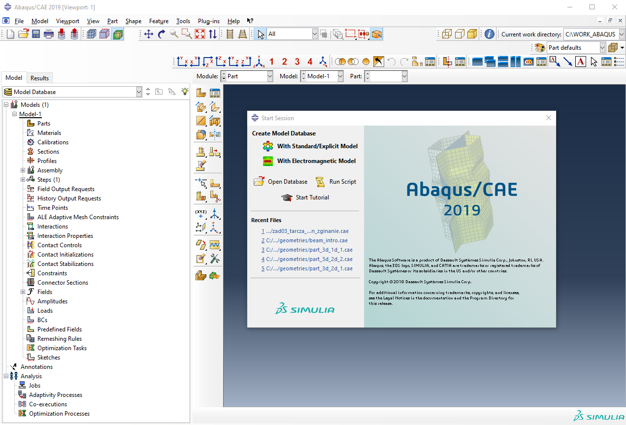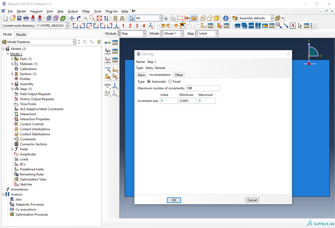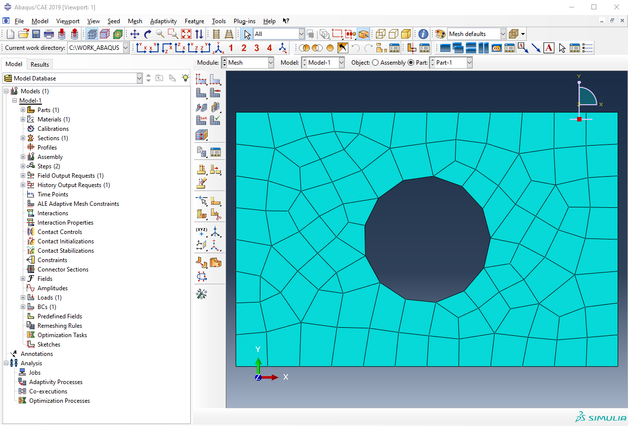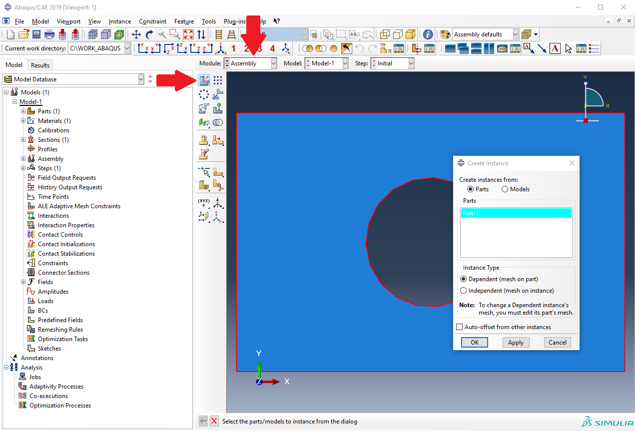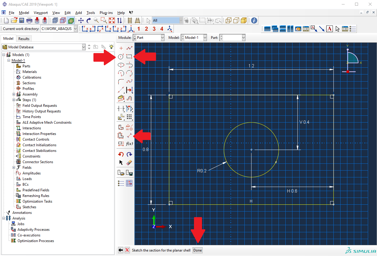 Abaqus automatycznie przenosi nas do modułu "Sketch" gdzie rysujemy kształ zgodnie z rysunkiem używając "Create Circle", "Create Lines: Rectangle" i "Add Dimension"