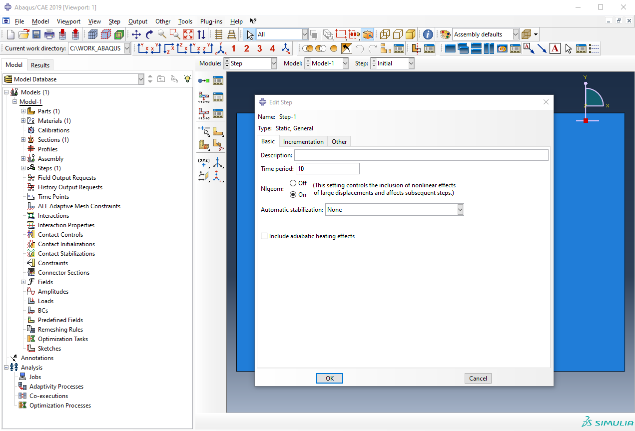 Ustawiamy czas symulacji "Time period" równy 10$s$ i parametr "Nlgeom" na "On".