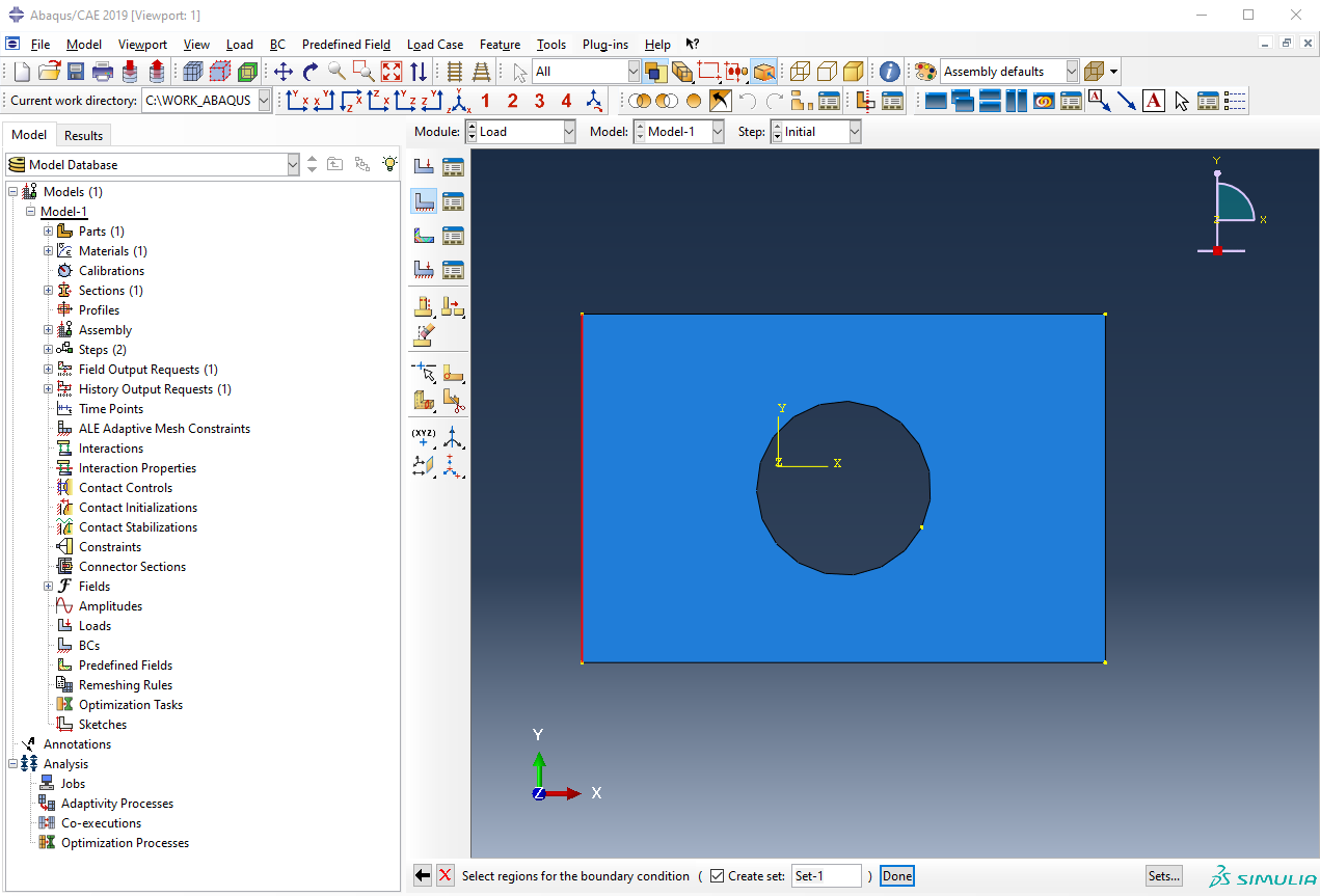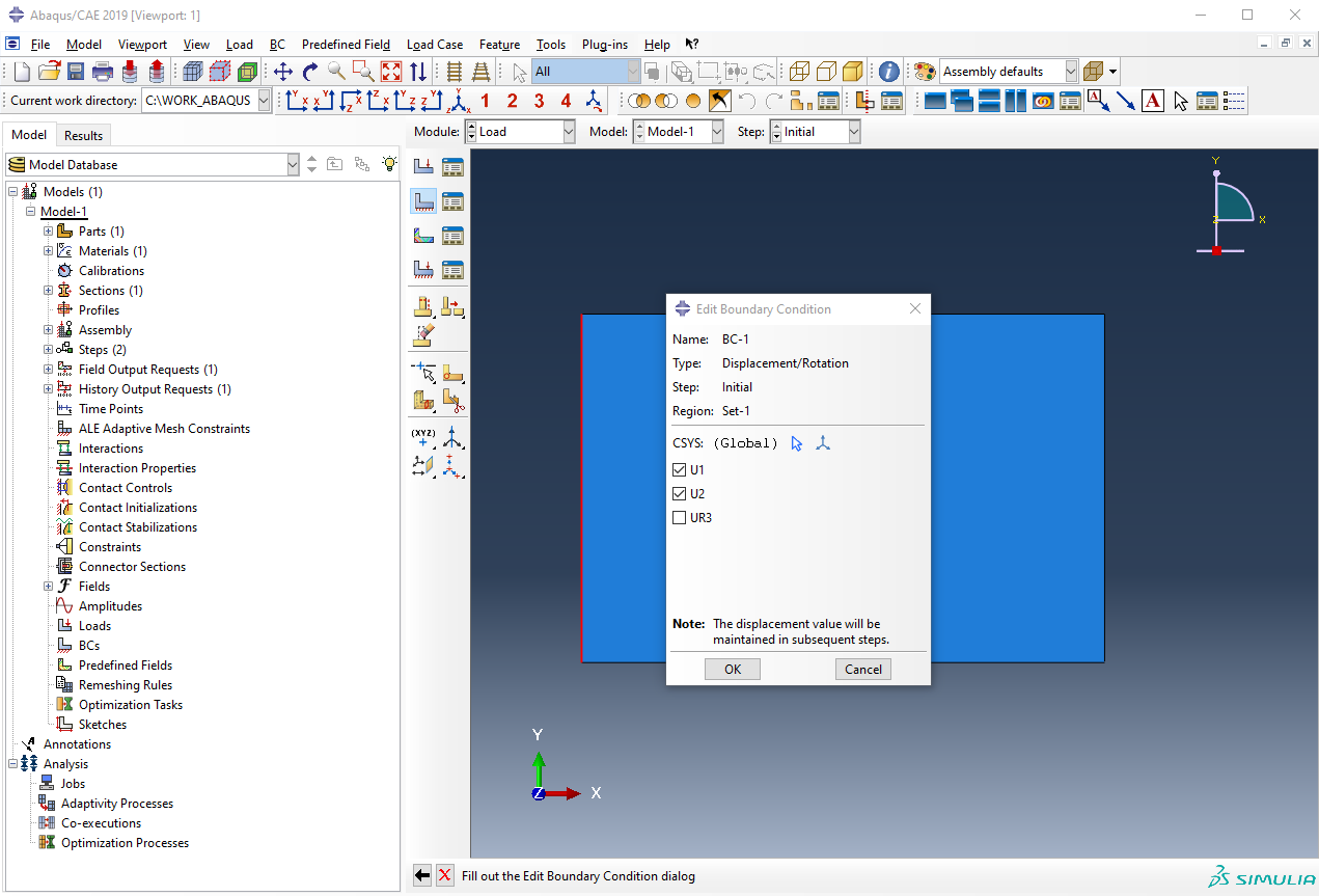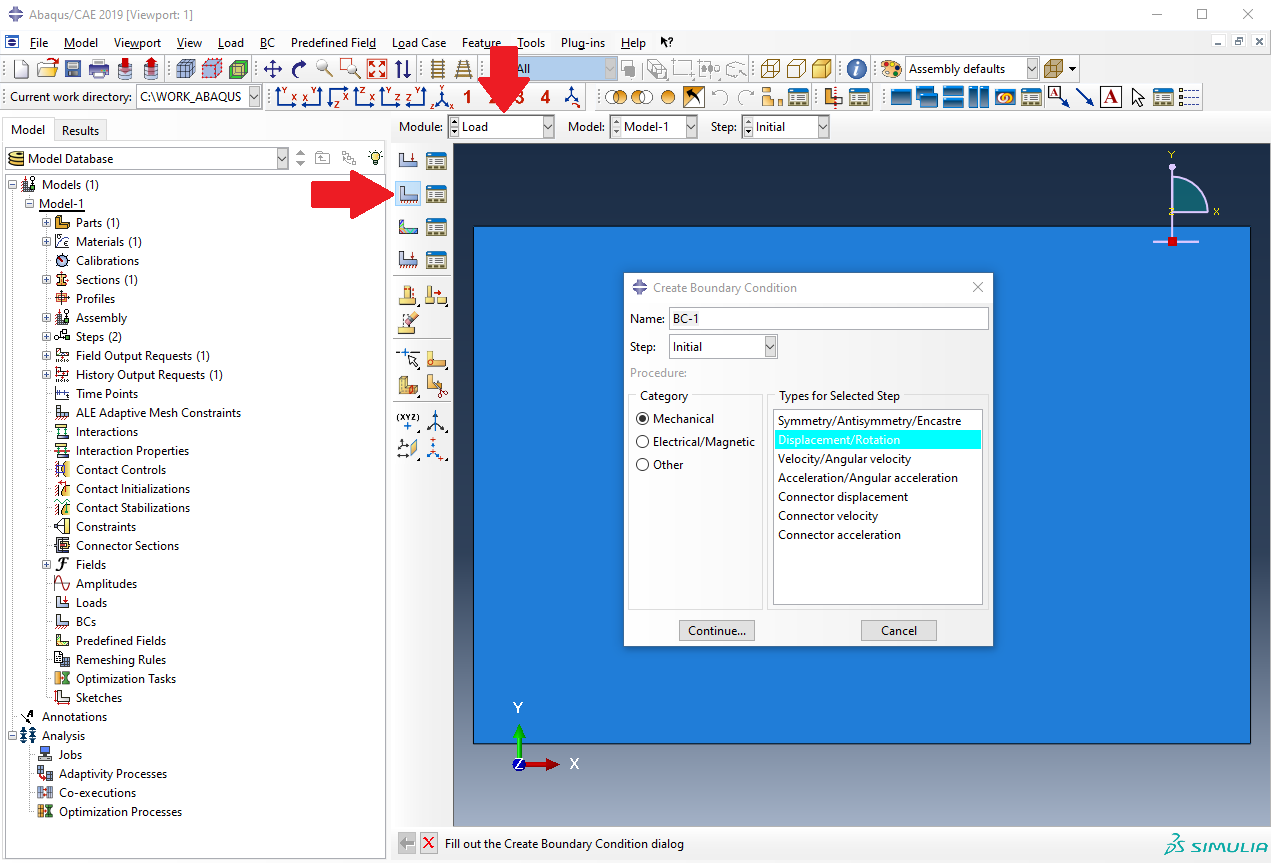 Przechodzimy do modułu "Load". Klikamy "Create Boundary Condidtion". Ustawiamy "Step" na "Initial oraz "Category" na "Mechanical". Wybieramy "Displacement/Rotation". Klikamy "Continue"