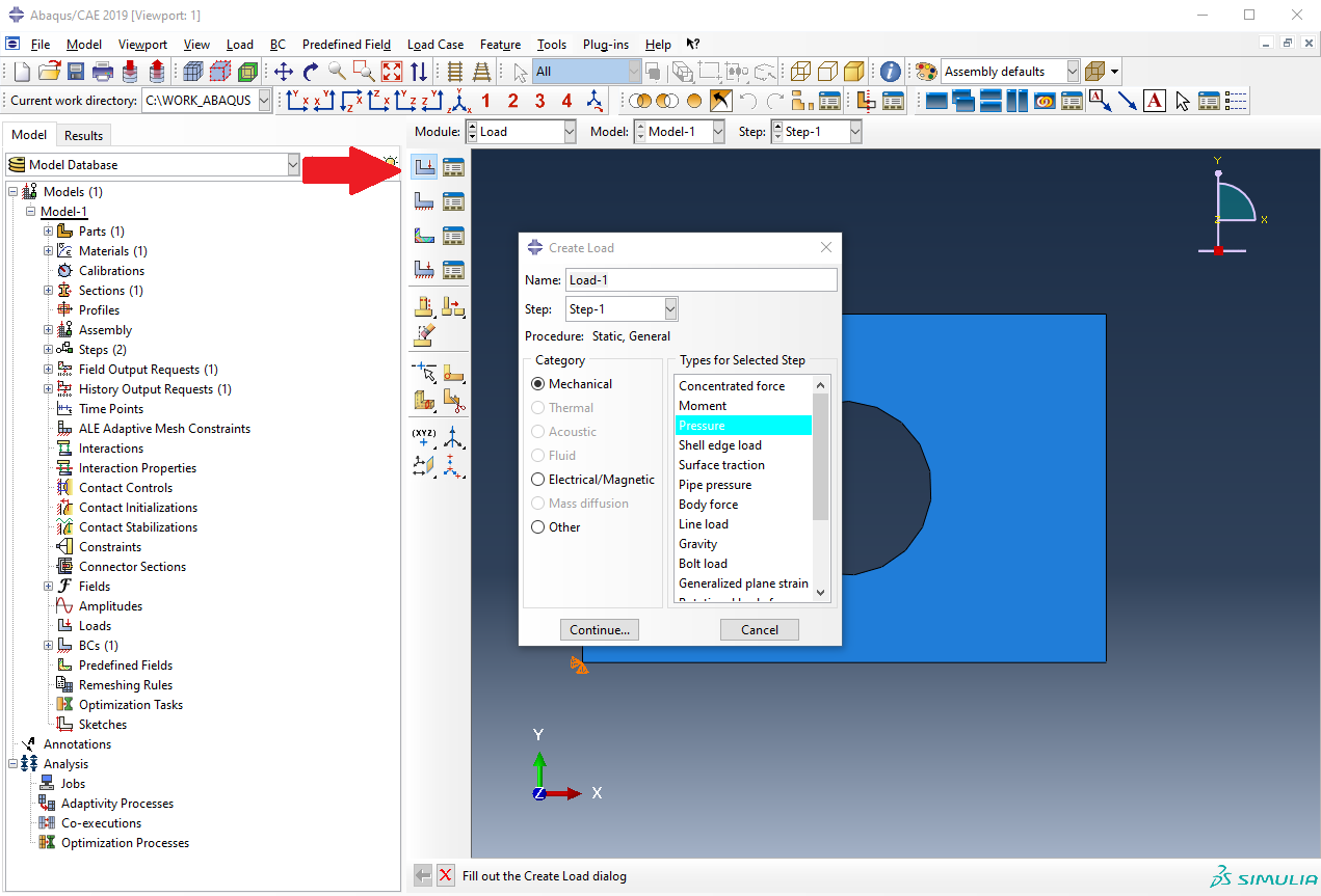 Klikamy "Create Load". Ustawiamy "Step" na "Step-1" oraz "Category" na "Mechanical". Wybieramy "Pressure". Klikamy "Continue".