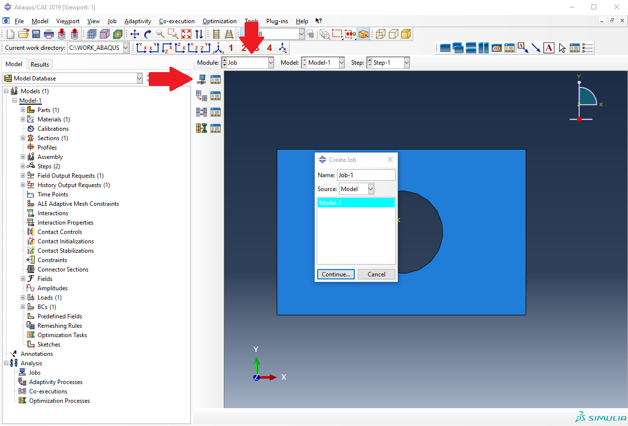Przechodzimy do modułu "Job" i klikamy "Create Job". Jeżeli chcemy możemy zmienić nazwe naszego zadania (tak będą nazywały sie wszystkie pliki zwierające rezutltaty obliczeń). Klikamy "Continue".