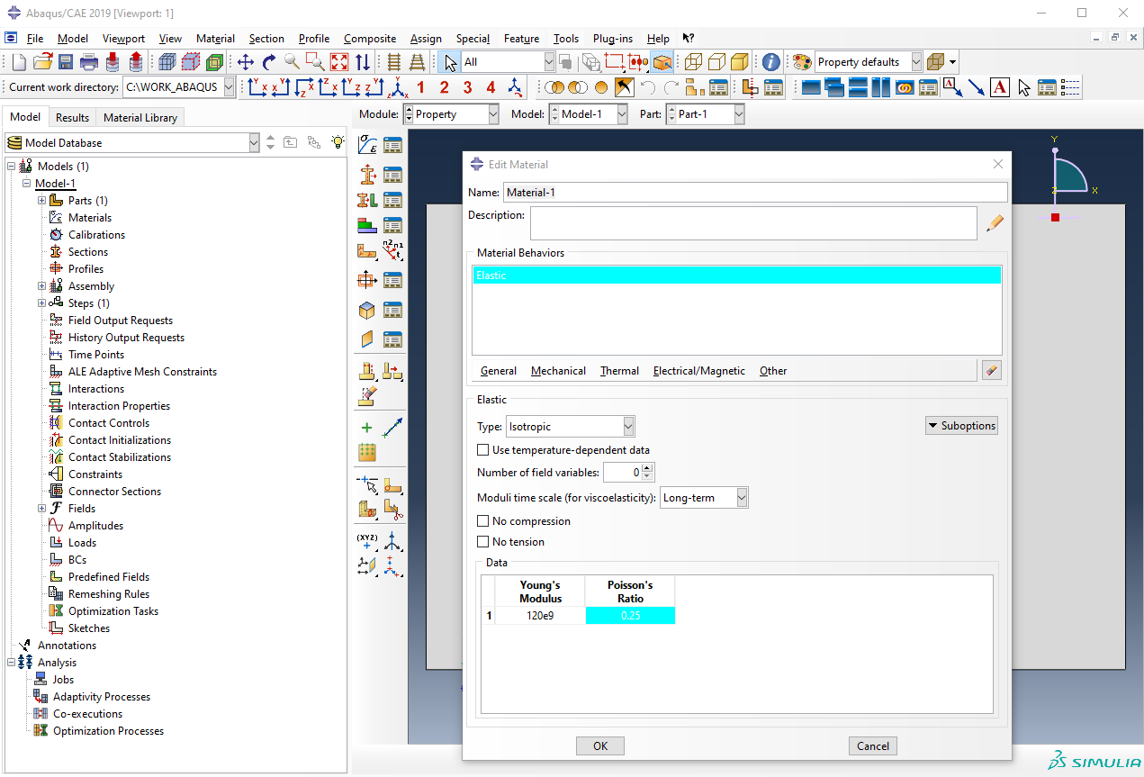 Przechodzimy do modułu "Property" i klikamy "Create Material". Z listy wybieramy "Mechnical->Elasticity->Elastic".