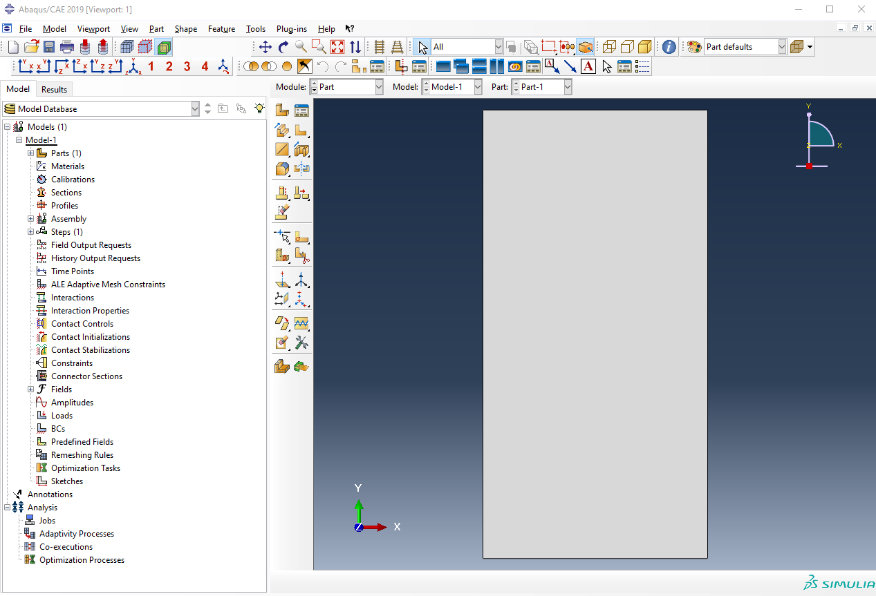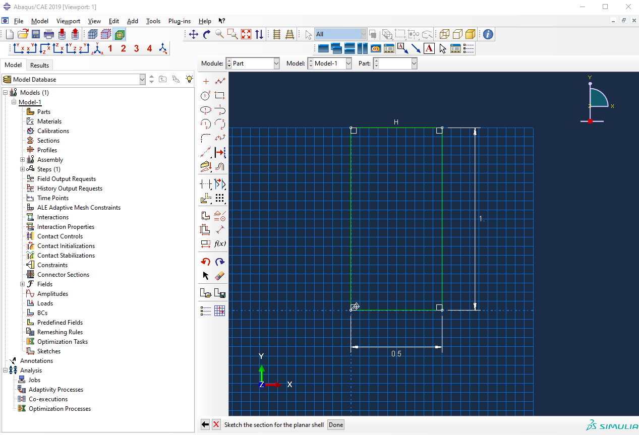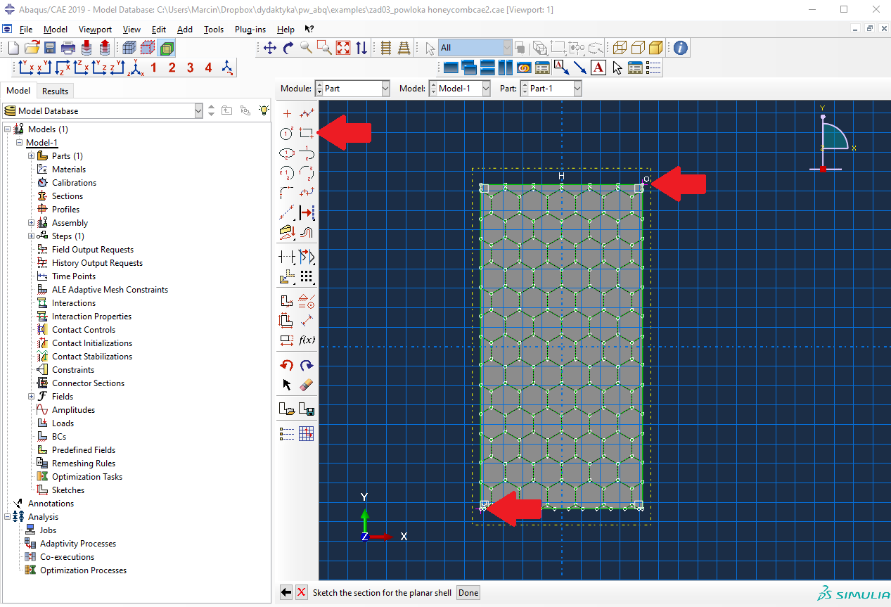 Abaqus automatycznie przenosi nas do modułu "Sketch" gdzie rysujemy prostokąt o wymiarach jak na rysunku. Lewy dolny róg prostokąta powinien mieć współrzędne 0,0.