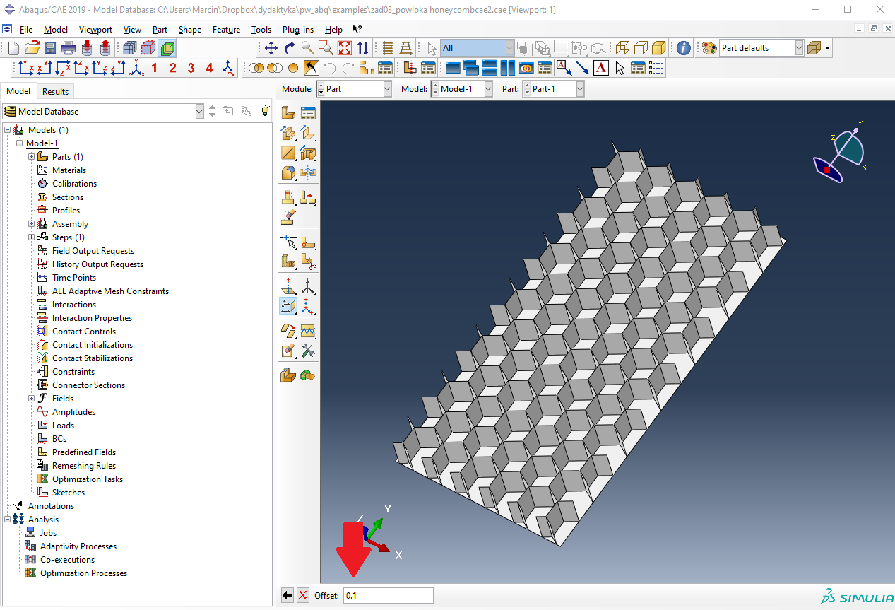 Wpisujemy "Offset" równy 0.1, tak aby utworzona płaszczyzna była nad wyciągnięta strukturą plastra miodu.