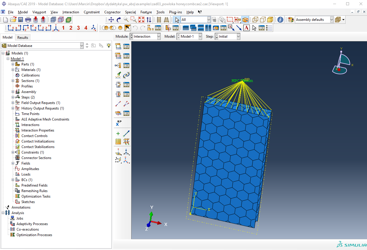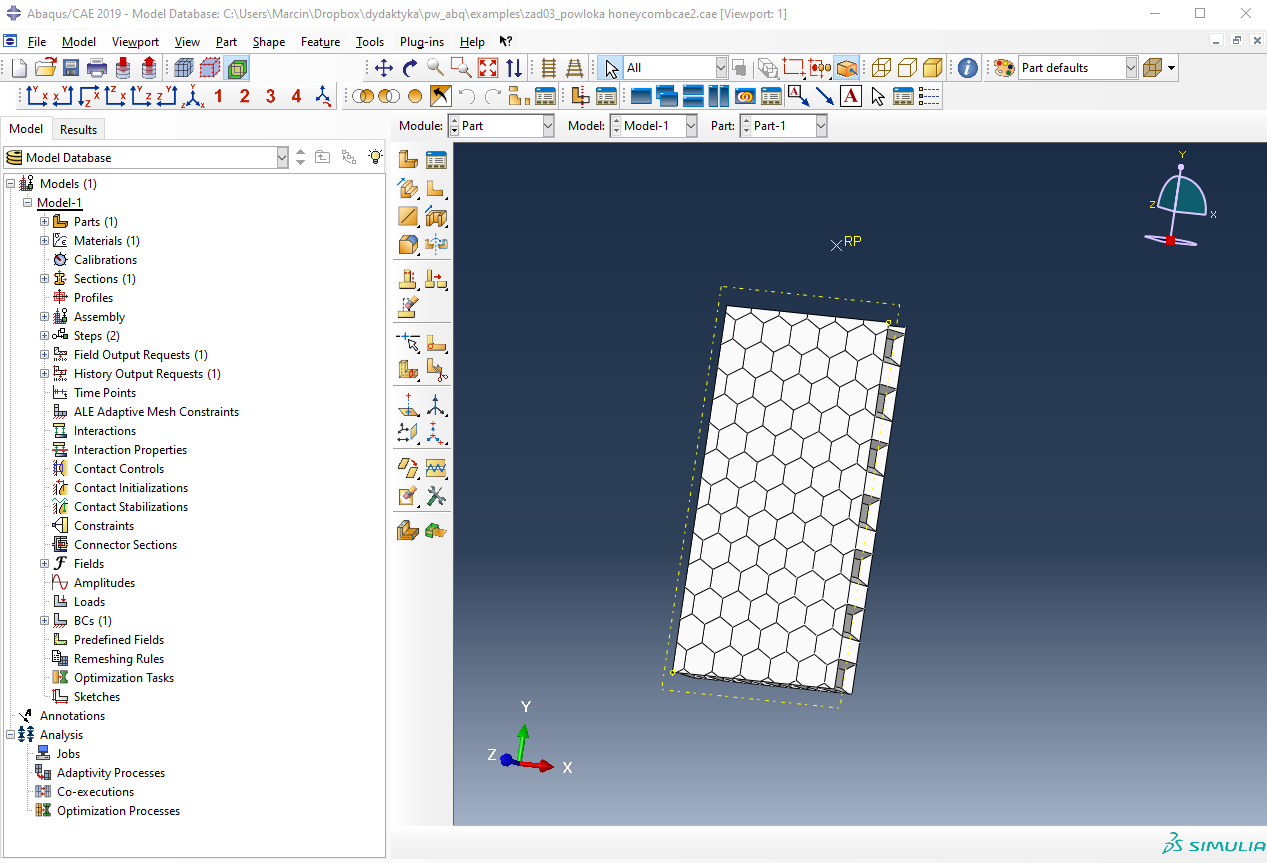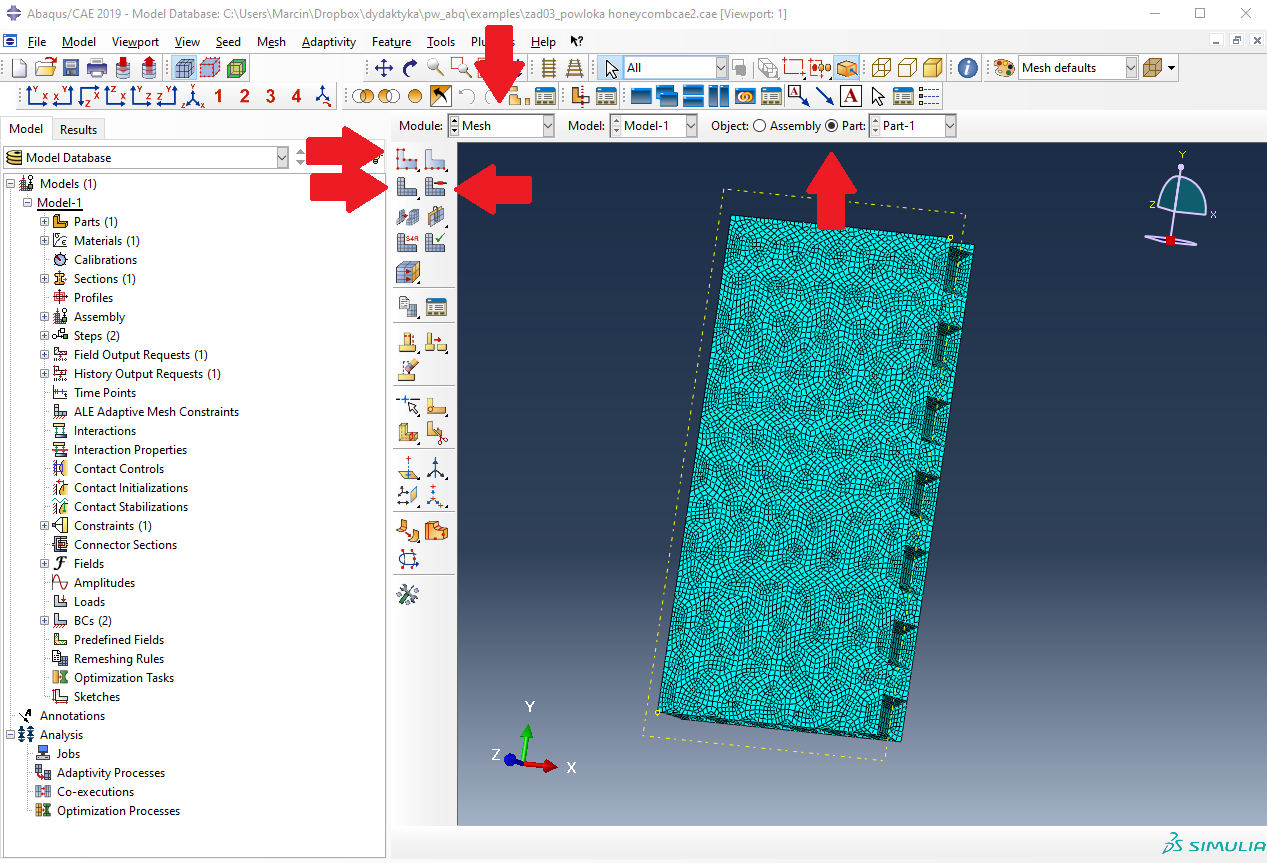 Przechodzimy do modułu "Mesh". Używając funkcji "Seed Part Instance", "Assign Mesh Control" oraz "Mesh Part Instance" generujemy siatkę.