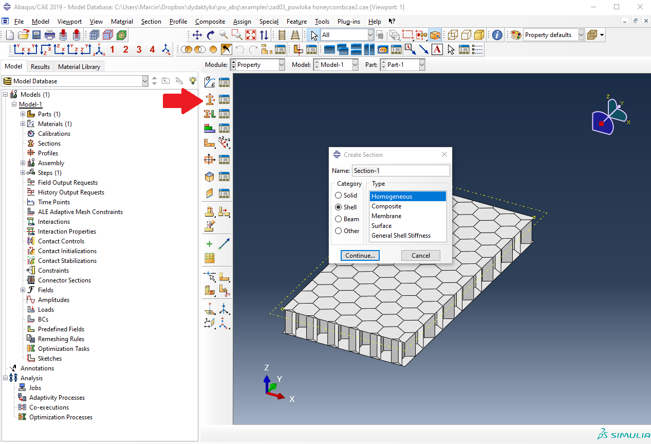 Przechodzimy do modułu "Property". Tworzymy materiał klikając "Create material". Wybieramy "Mechanical->Elasticity->Elastic" i wpisujemy parametry dla Aluminum zgodnie z rysunkiem.
