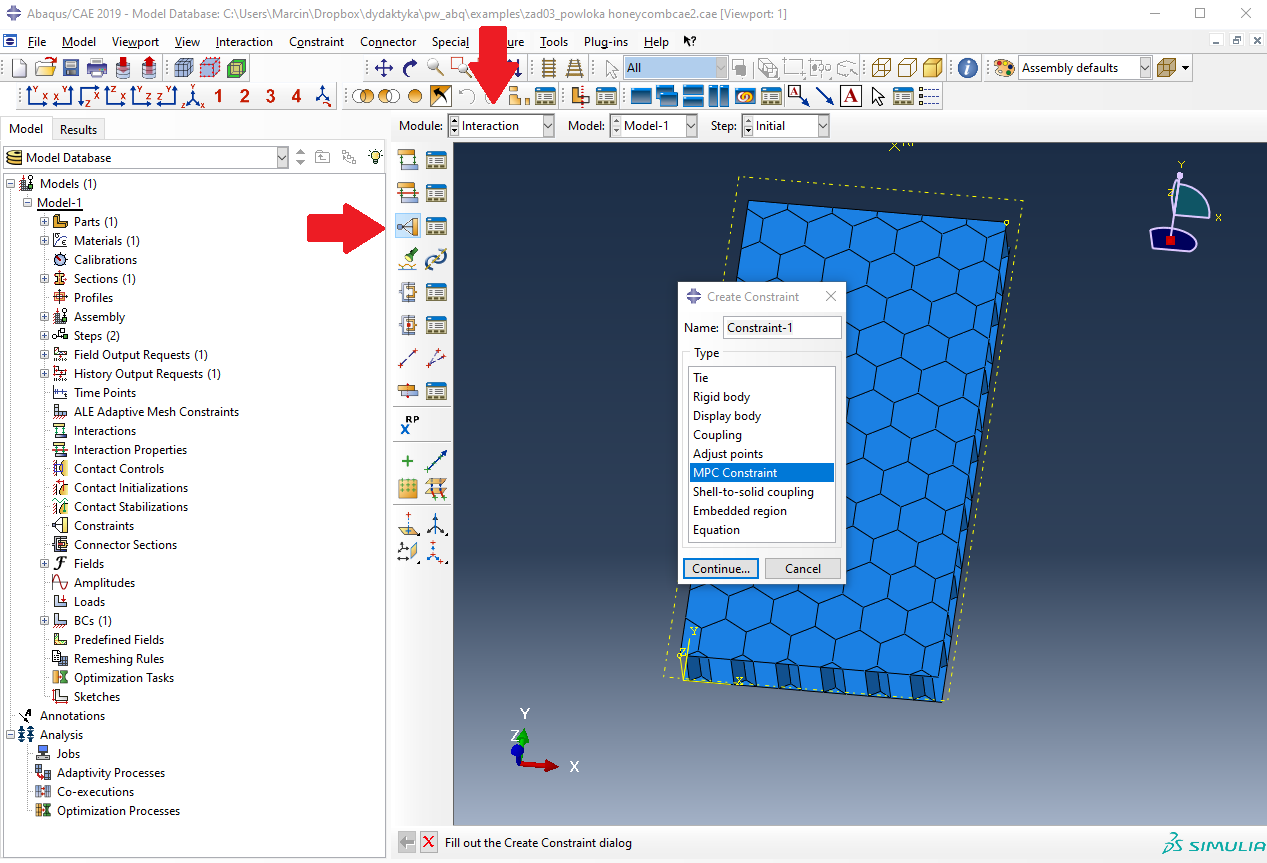 Przechodzimy do modułu "Interaction". Klikamy "Create Constraint". Wybieramy "MPC Constraint" i klikamy "Continue".