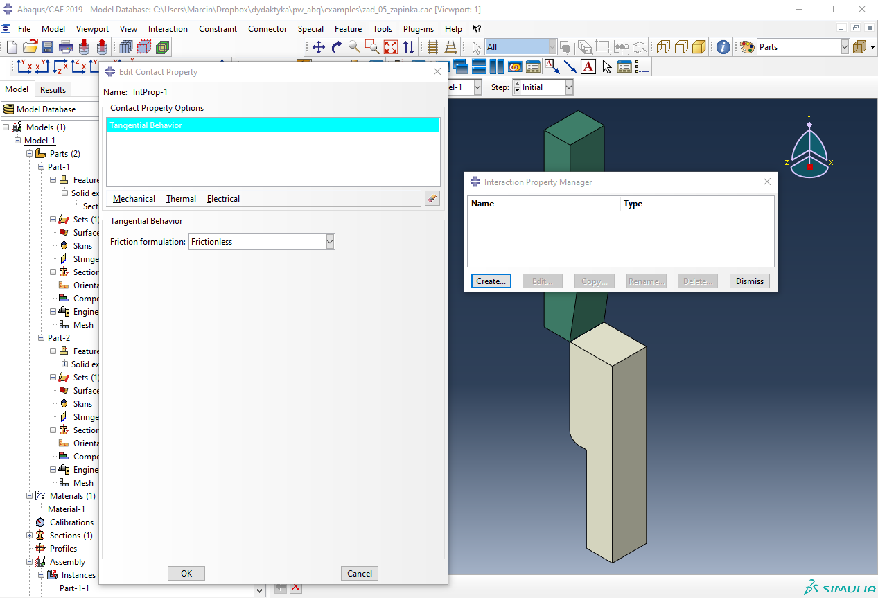 Z okienka wybieramy "Mechanical->Tangential Behavior" i ustawiamy parametry zgodnie z rysunkiem.