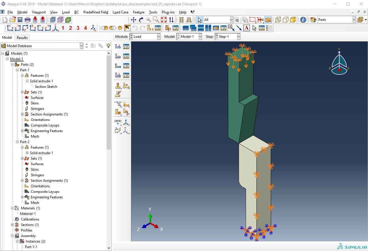 Przechodzimy do modułu "Load" i tworzymy przemieszczeniowe warunki brzegowe zgodnie z rysunkiem.