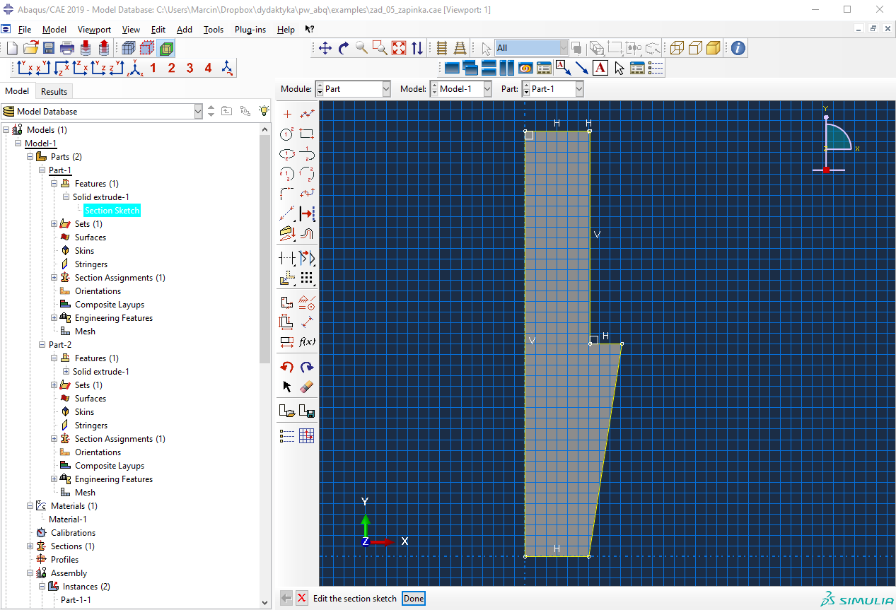 W module Part klikamy "Create Part" i wybieramy ustawienia "Modeling Space: 3D", "Type: Deformable", "Shape: Solid->Eextrusion". Tworzymy part jak na rysunku