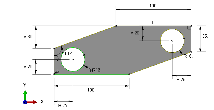 Analizowana część pełni rolę łącznika. Na brzegu lewego otworu należy zablokować możliwość przemieszczania się. Do brzegu prawego otworu należy zadać przemieszenie powodujące przesuw w prawą stronę o wartość równą średnicy otworu.