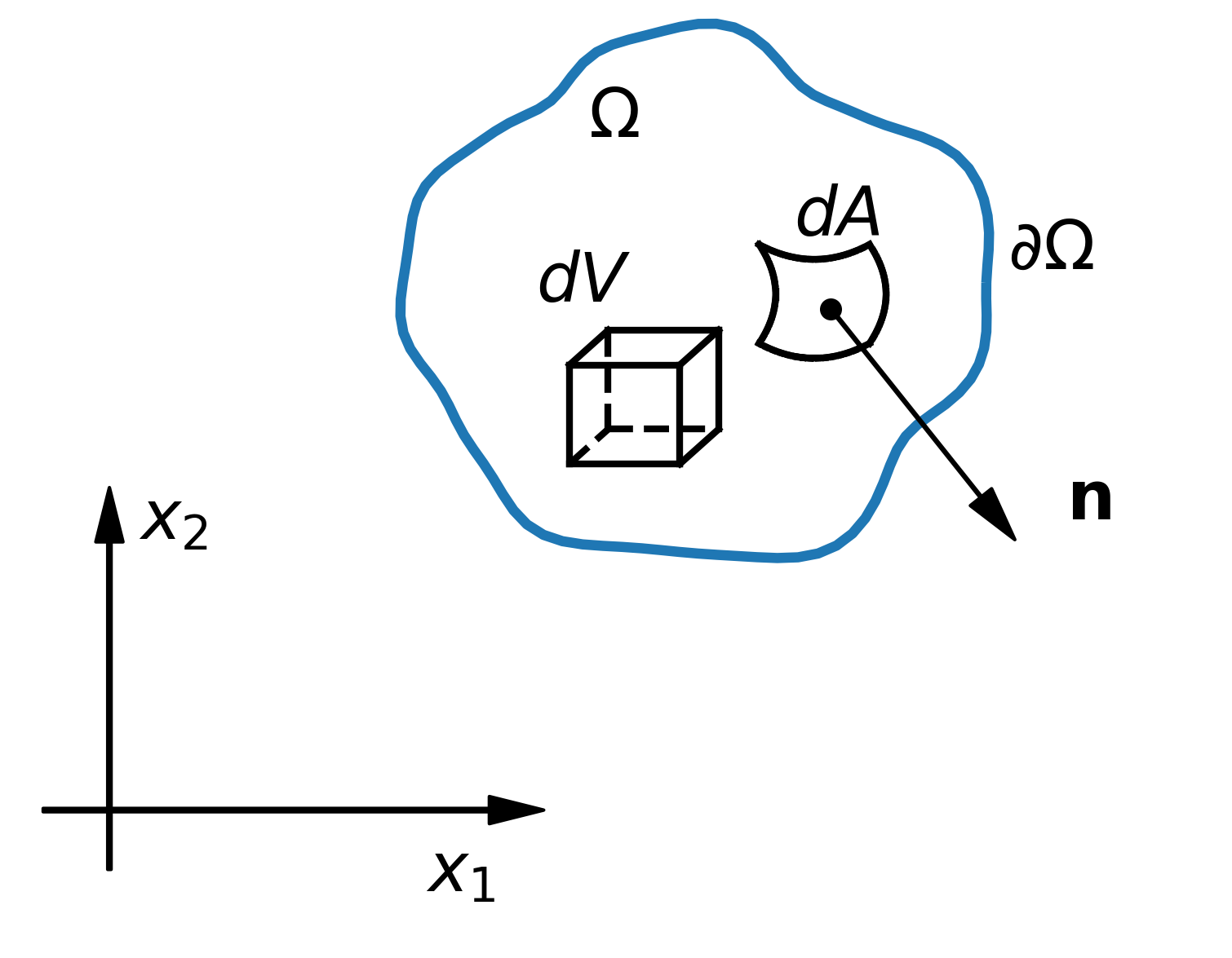 $$\int_\Omega \grad \A(\x)\;dV=\int_{\dom}\A(\x)\otimes\n\;dA \qquad\qquad \int_\Omega A_{ij\ldots n,p}\;dV=\int_{\dom} A_{ij\ldots n} n_p\;dA$$• ogólnie, dla dowolnego typu wyrażeń podcałkowych, obowiązuje reguła