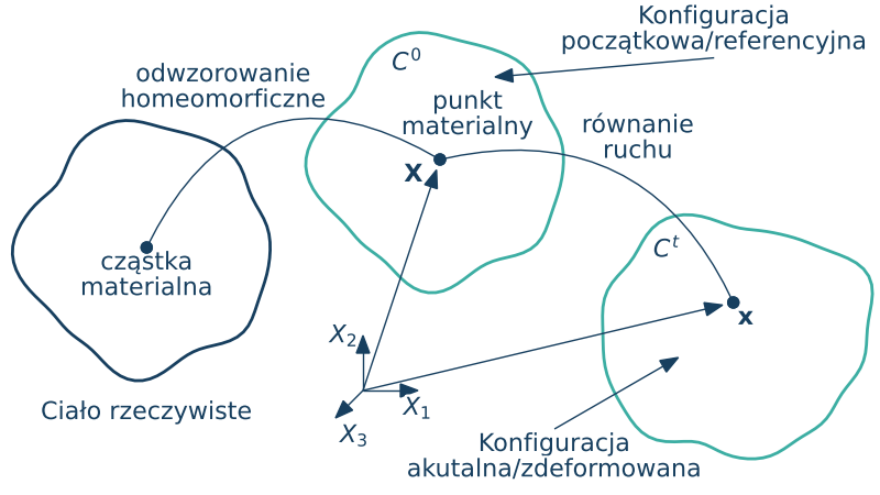• konfiguracji odniesienia $C^r$ w której punkty materialne zostaną zdefiniowane przez ich współrzędne $\X$. Tą konfigurację będziemy utożsamiać z konfiguracją $C^0$.