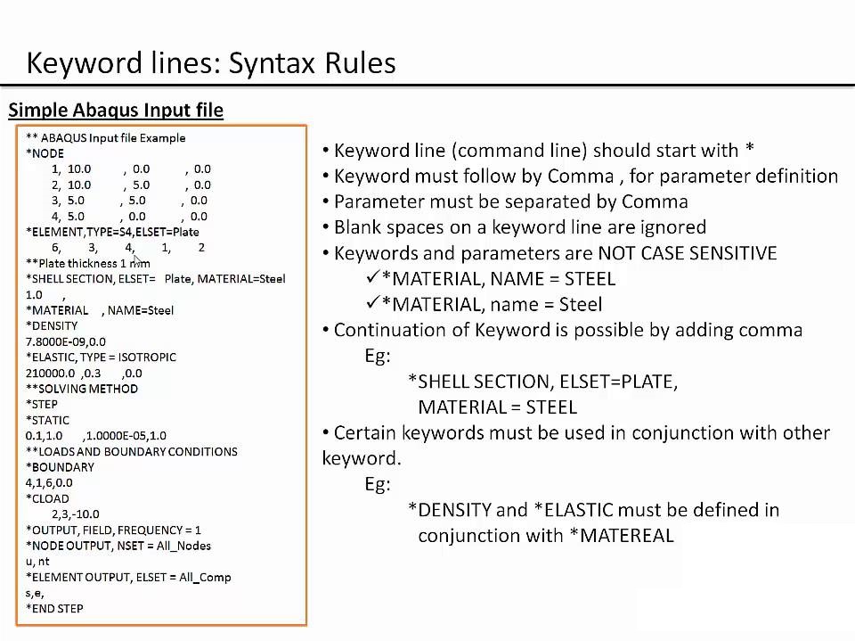 The input file is the means of communication between the preprocessor, usually ABAQUS/CAE, and the analysis product, ABAQUS/Standard. It contains a complete description of the numerical model. The input file is a text file that has an intuitive, keyword-based format, so it is easy to modify using a text editor if necessary; if a preprocessor such as ABAQUS/CAE is used, modifications should be made using it. Indeed, small analyses can be specified easily by typing the input file directly.