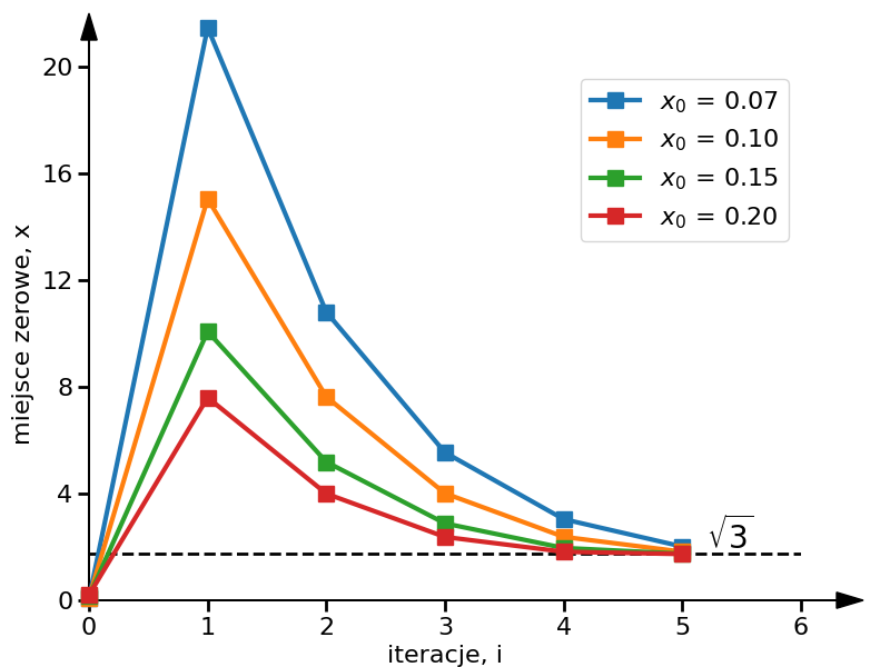 Wraz z kolejnymi iteracjami dostajemy coraz lepsze oszacowanie, które wynosi $\sqrt{3} = 1.732050807568872...$. Nawet gdy nasz punkt startowy będzie daleko od dokładnej wartości metoda Newtona bardzo szybko będzie zbiegać do poprawnej wartości. Mówimy że metoda ta ma kwadratową zbieżność. Zestawmy otrzymane wyniki w tabeli