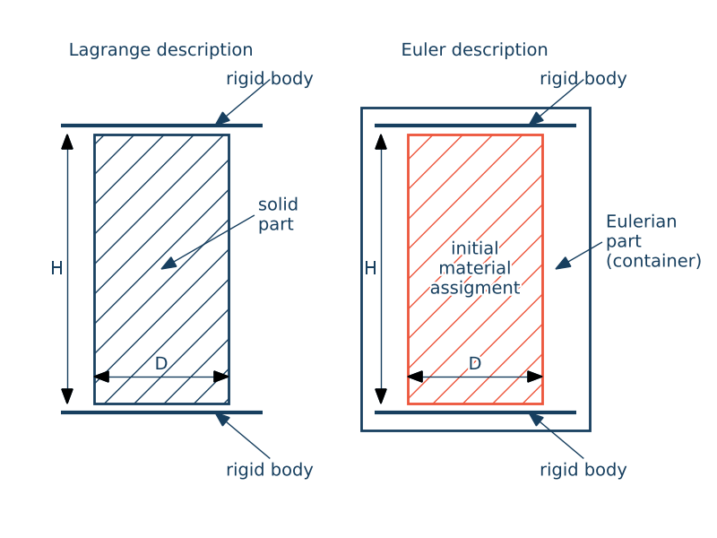 In the first model, the Lagrangian approach is used, where the material points remain fixed within the deforming body. In the second model, the Eulerian approach is applied, where the material flows through a fixed computational mesh, with the initial material assignment specified.