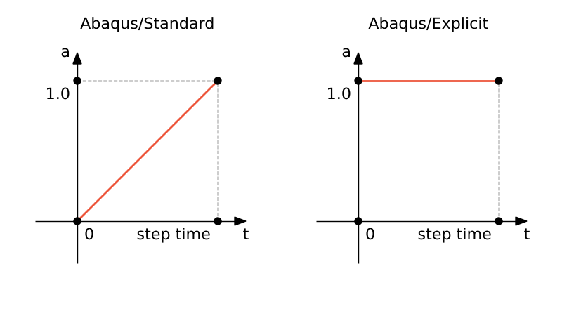 By default, the values of loads, boundary conditions, and predefined fields either change linearly with time throughout the step (ramp function) or they are applied immediately and remain constant throughout the step (step function).