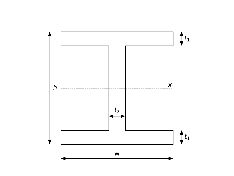 • Opracuj program który oblicza moment bezwładności $I_x$, pole powierzchni $A$ dla dwuteownika jak na rysunku.