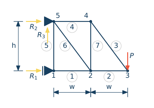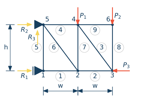 $$\begin{array}{ccccccccc} 4x_1 & + & 2x_2 & + & 3x_3 & + & 7x_4 &=& 3\\ 8x_1 & + & 9x_2 & + & x_3 & - & 2x_4 &=& 8\\ x_1 & - & 2x_2 & + & 7x_3 & - & 5x_4 &=& -3\\ -2x_1 & - & 5x_2 & + & 6x_3 & - & 8x_4& =& -2\\ \end{array}$$Zbuduj układ równań liniowych dla podanej kratownicy korzystając z metody równoważenia węzłów. Następnie rozwiąż układ i wyświetl siły w każdym pręcie kratownicy