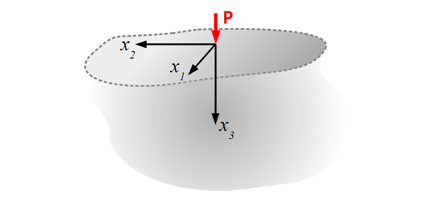 Zagadnienie Boussinesqa dotyczy liniowej teorii sprężystości i polega na wyznaczeniu naprężeń, odkształceń oraz przemieszczeń w jednorodnej, izotropowej półprzestrzeni sprężystej (materiał Hooke'a) obciążonej siłą skupioną, przyłożoną na płaszczyźnie ograniczającej półprzestrzeń, prostopadłą do niej. Siła ma wartość $P$, a materiał charakteryzują stałe sprężyste $\lambda$ i $G$. Zakłada się brak przemieszczeń i obrotów półprzestrzeni oraz minimalny wpływ siły w odległych punktach. Siła działa w początku układu współrzędnych wzdłuż osi $x_3$,