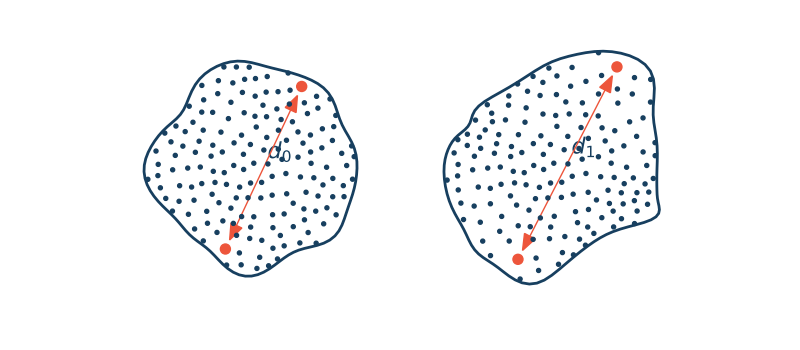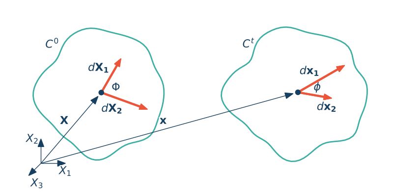 Wybierzmy dwa włókna materialne $d\X_1$ i $d\X_{2}$ w konfiguracji odniesienia oraz ich transformację w konfiguracji aktualnej $d\x_{1}$ i $\mathrm{d}\x_{2}$ tak aby