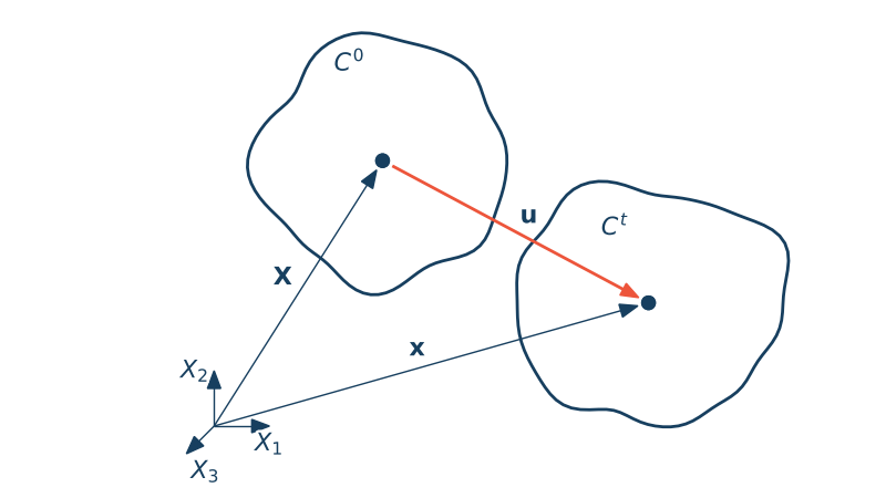 Przypiszmy dowolnemu punktowi $A$ współrzędne $\X = [X_1, X_2, X_3]$. Ten sam punkt po odkształceniu zmieni swoje położenie. Jego nowe współrzędne będą równe $\x = [x_1, x_2, x_3]$. Wektorom przemieszczenia punktu materialnego nazywamy wektor
