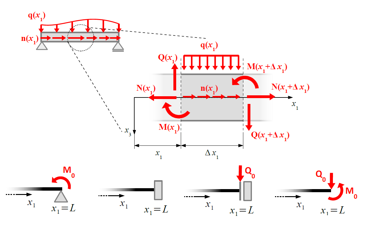$$Q(x) = -EI \dd{^3w(x)}{x^3}$$Warunki brzegowe konstruujemy poprzez odpowiednie zapisanie znanych wartości ugięcia, kąta obrotu, momentu zginającego oraz siły poprzecznej dla różnych sposobów podparcia i obciążenia belki na jej końcach.