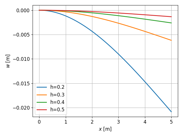 $$w(x) = \cfrac{-6L\,P\,x^2}{E\,b\,h^3} + \cfrac{2P\,x^3}{Ebh^3}$$from sympy import Function, dsolve, Derivative