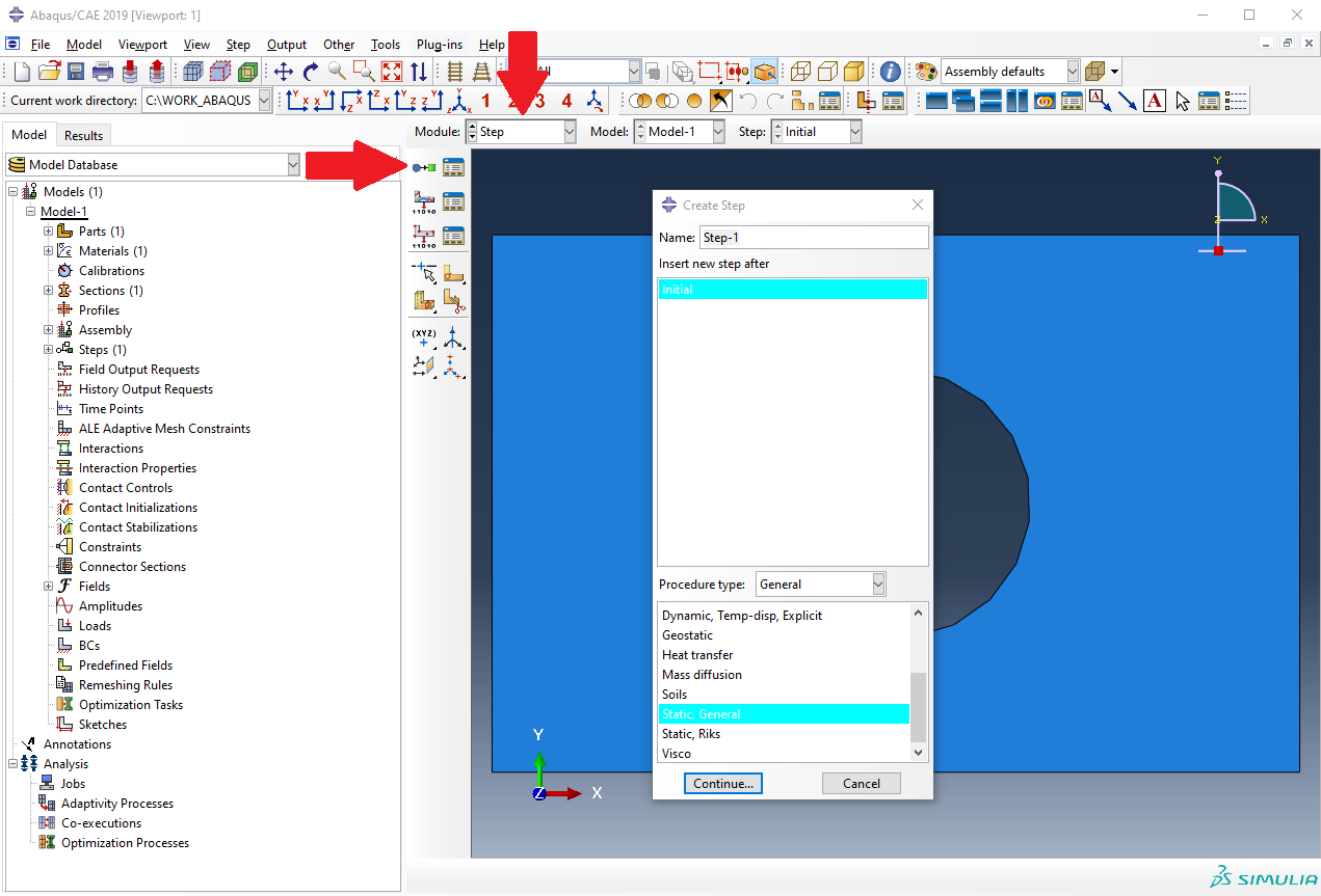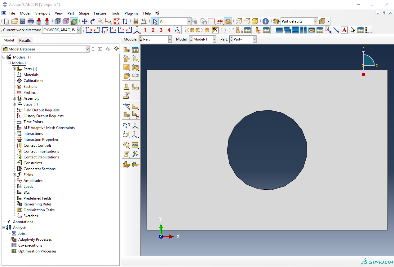 Abaqus automatycznie przenosi nas do modułu "Sketch" gdzie rysujemy kształ zgodnie z rysunkiem używając "Create Circle", "Create Lines: Rectangle" i "Add Dimension"