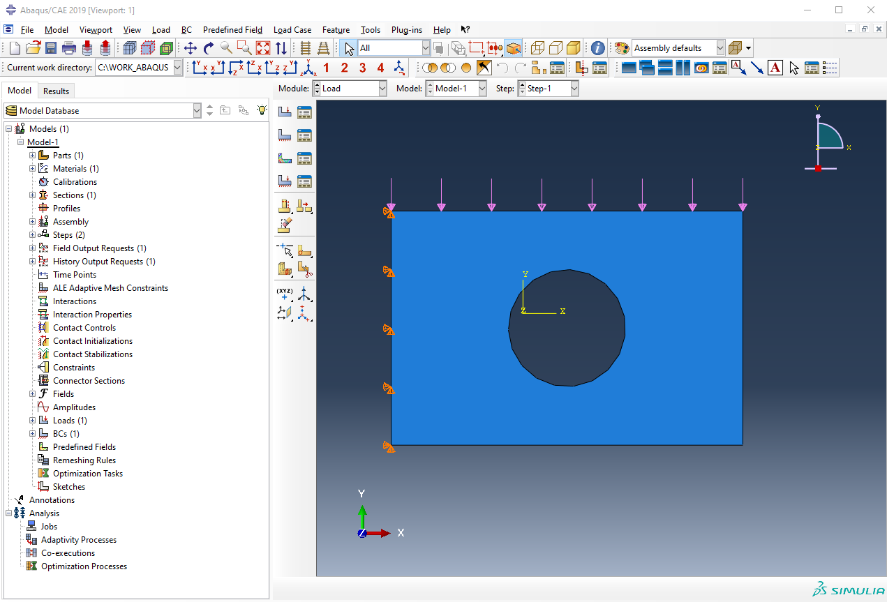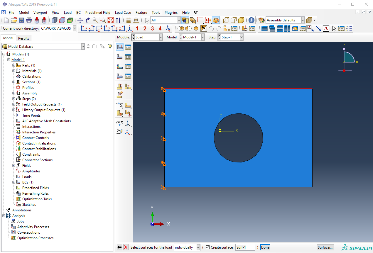 Przechodzimy do modułu "Load". Klikamy "Create Boundary Condidtion". Ustawiamy "Step" na "Initial oraz "Category" na "Mechanical". Wybieramy "Displacement/Rotation". Klikamy "Continue"