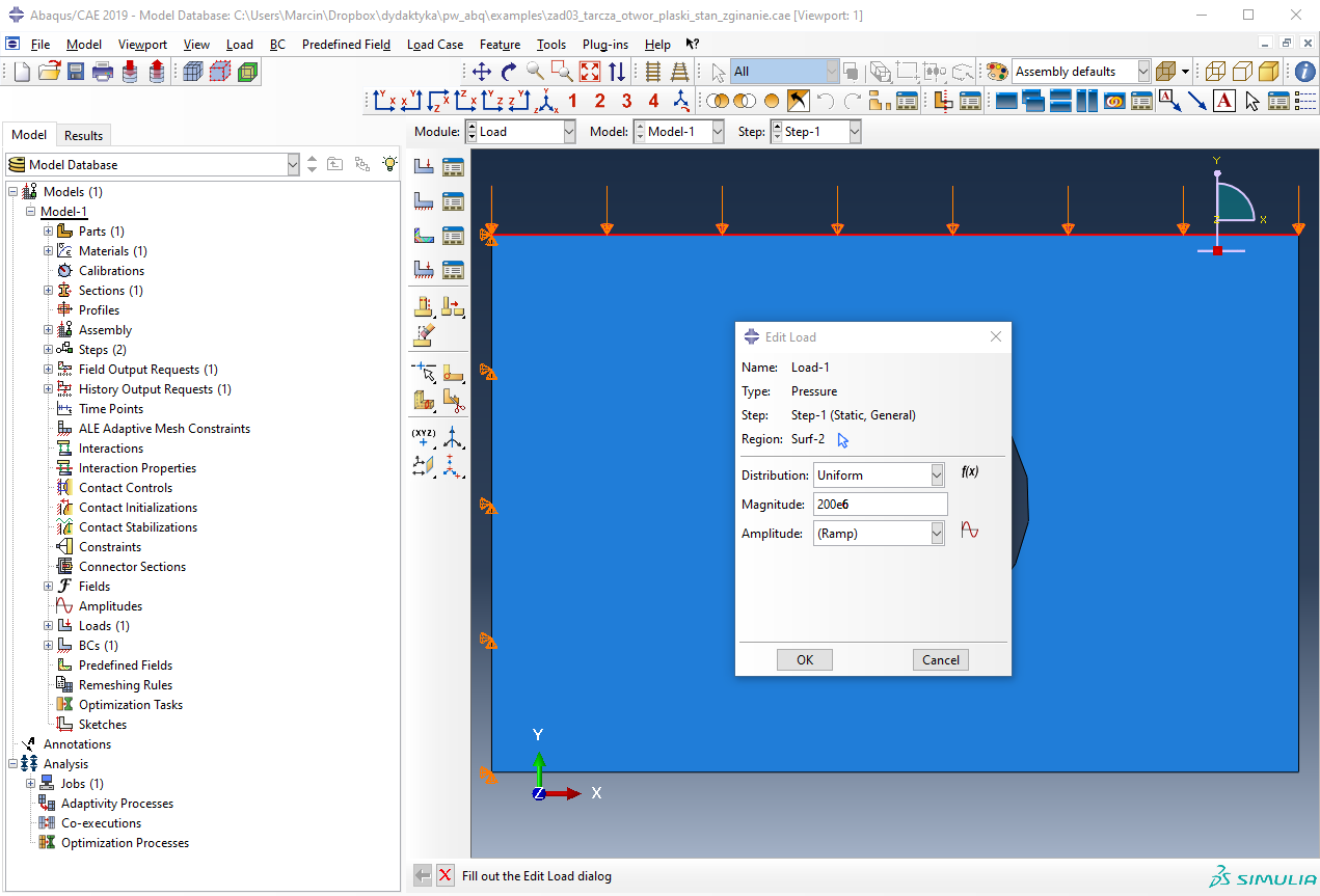 W okienku ustawiamy wartość "Magnitutde" na $200e6$Pa i klikamy "Ok"