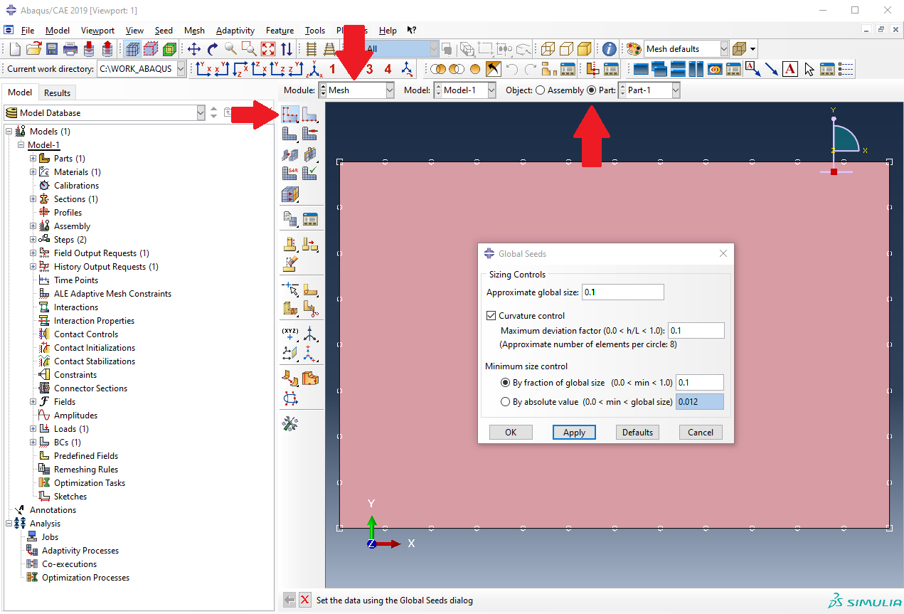 Przechodzimy do modułu "Mesh", zaznaczay "Object" jako "Part" i klikamy "Seed Part Instance". Ustawiamy "Approximate global size" równy $0.1$.