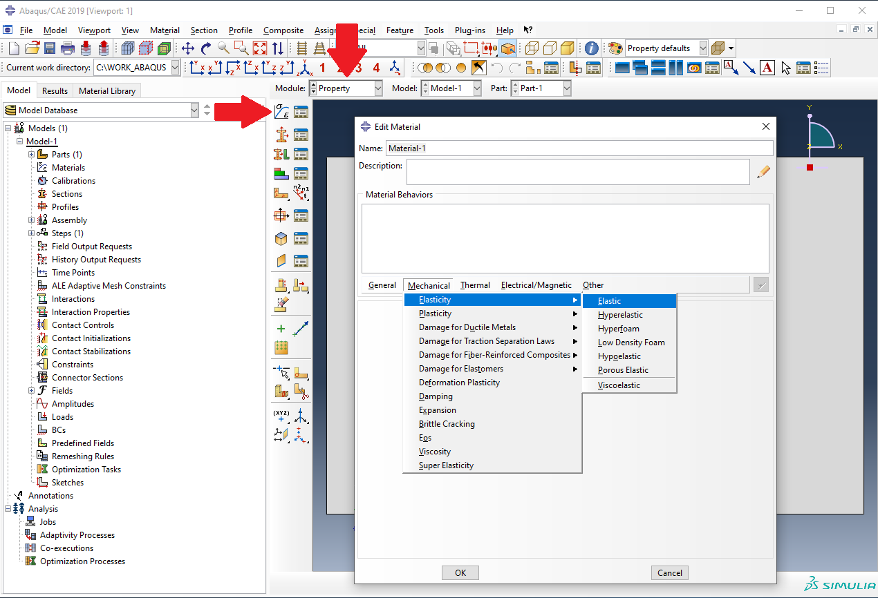 Przechodzimy do modułu "Property" i klikamy "Create Material". Z listy wybieramy "Mechnical->Elasticity->Elastic".