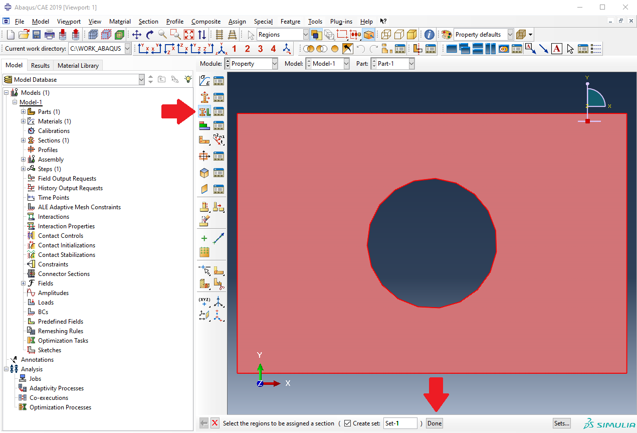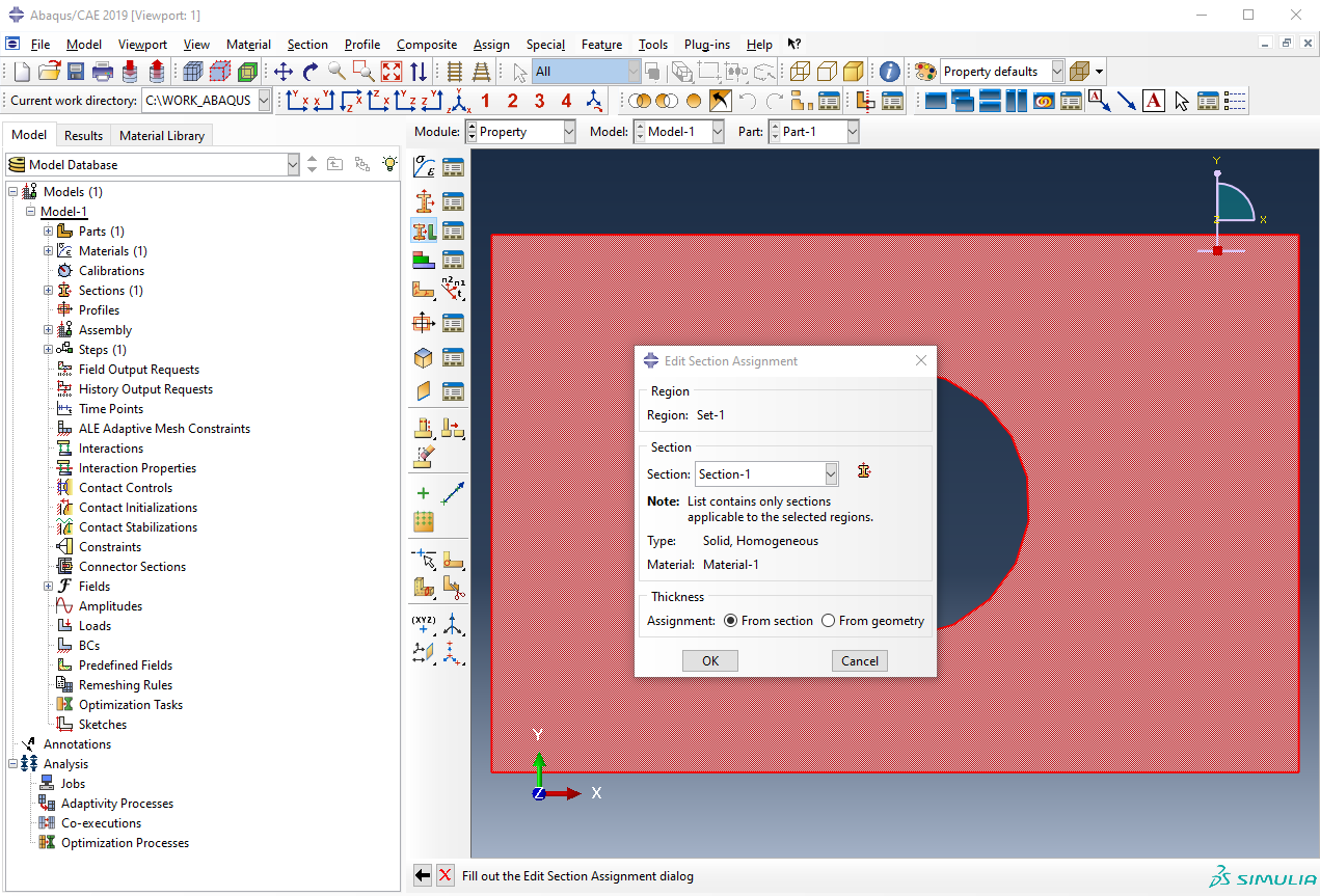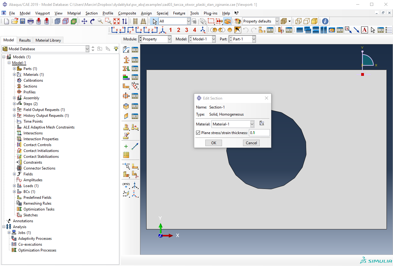 W kolejnym okienku przypisujemy do sekcji nasz materiał "Material-1" oraz zaznaczamy opcję "Plane stress/strain thickness i zmieniamy wartość na $0.1$m.