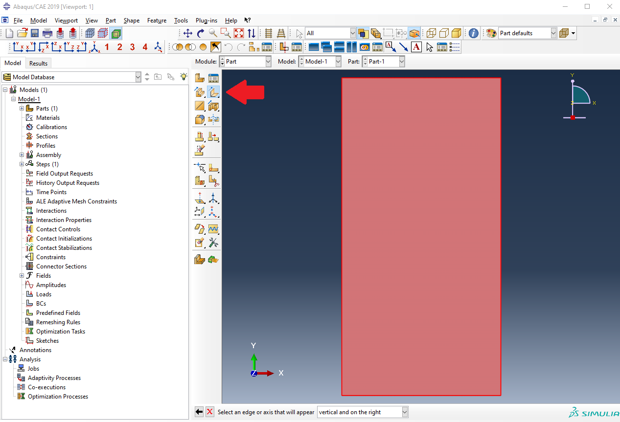 Abaqus automatycznie przenosi nas do modułu "Sketch" gdzie rysujemy prostokąt o wymiarach jak na rysunku. Lewy dolny róg prostokąta powinien mieć współrzędne 0,0.