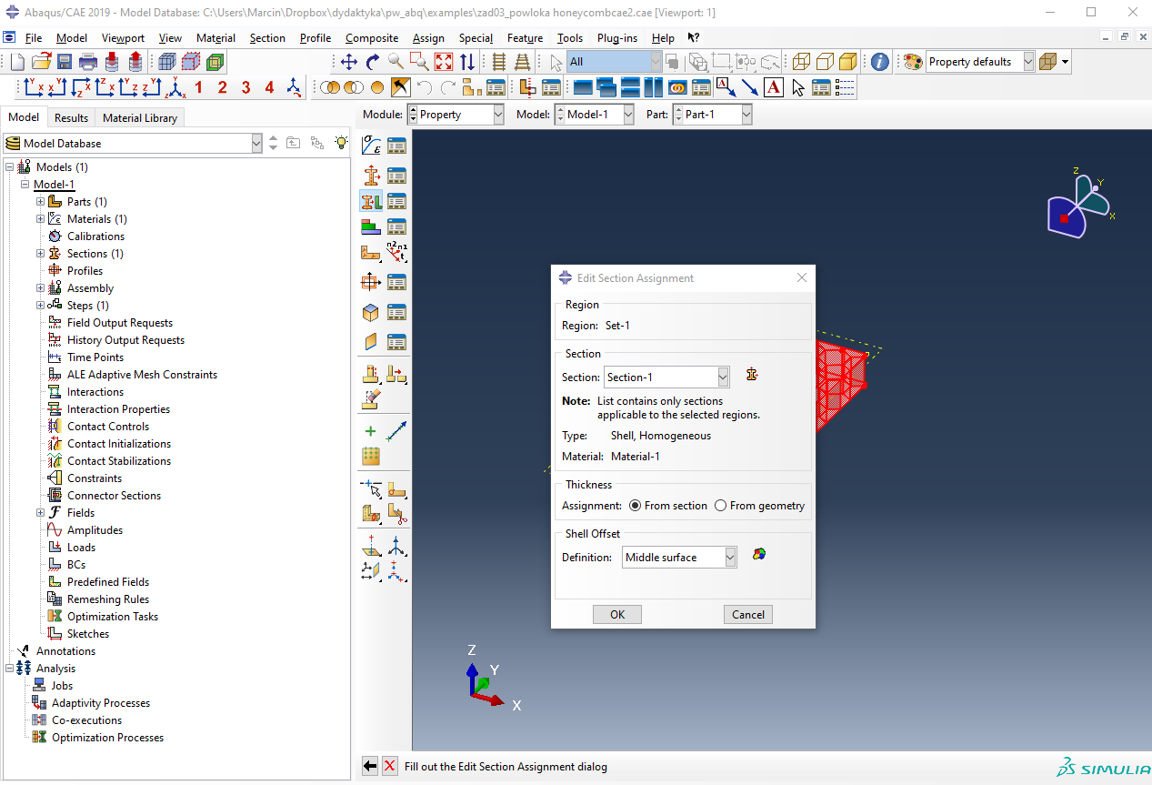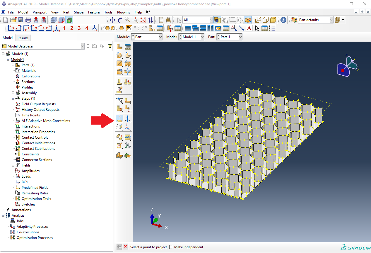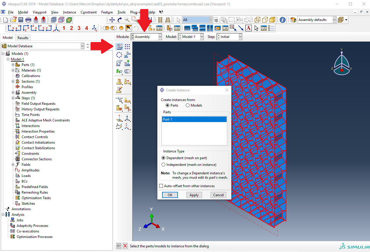 Przechodzimy do modułu "Mesh". Używając funkcji "Seed Part Instance", "Assign Mesh Control" oraz "Mesh Part Instance" generujemy siatkę.