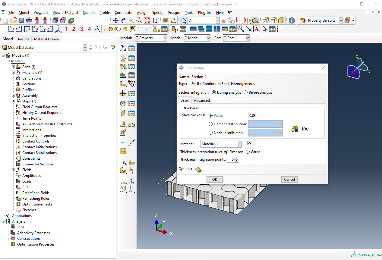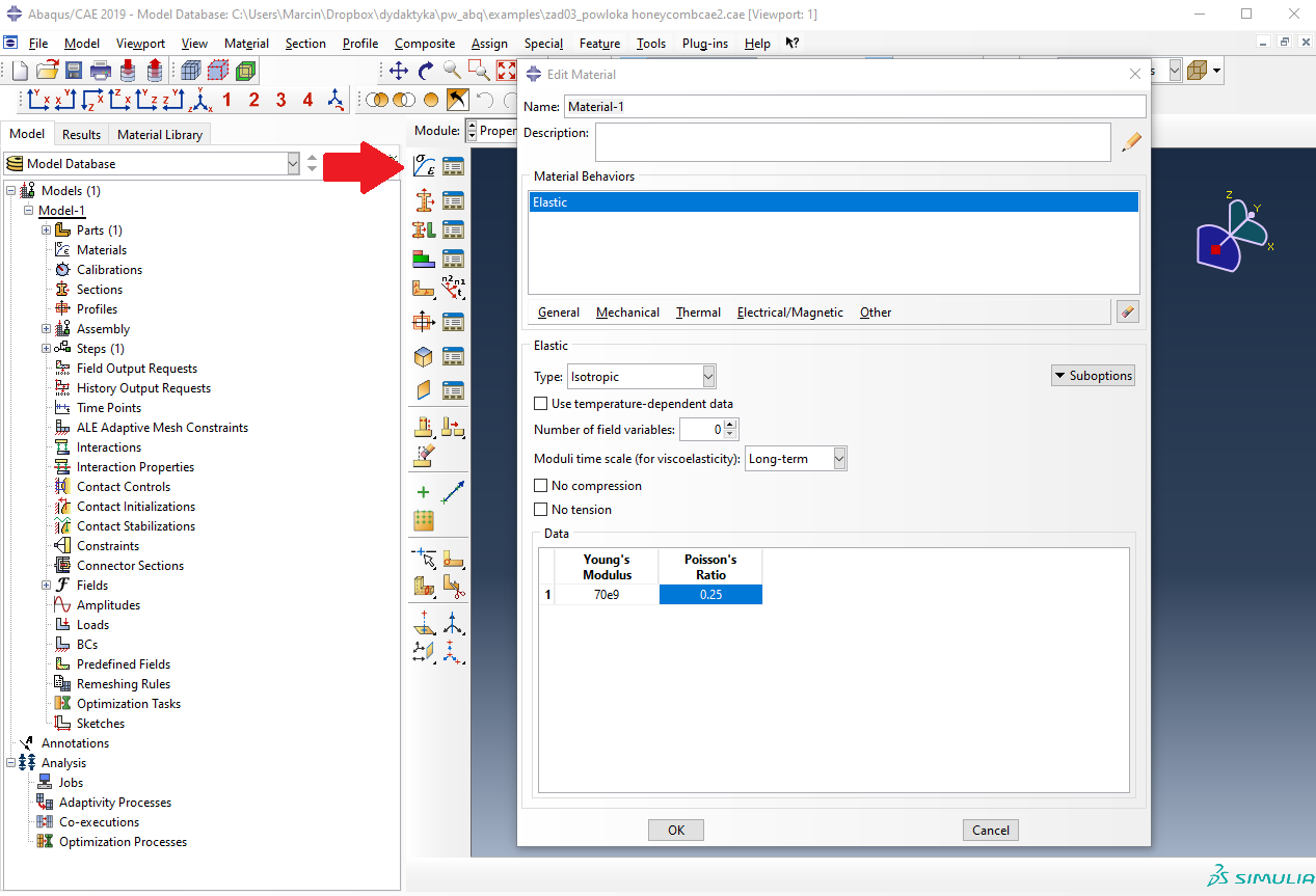 Przechodzimy do modułu "Property". Tworzymy materiał klikając "Create material". Wybieramy "Mechanical->Elasticity->Elastic" i wpisujemy parametry dla Aluminum zgodnie z rysunkiem.