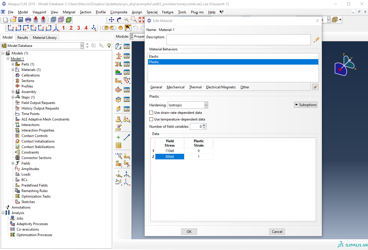 W podobny sposób z wybieramy "Mechanical->Plasticity->Plastic" i wpisujemy do tabelki parametry zgodnie z rysunkiem.