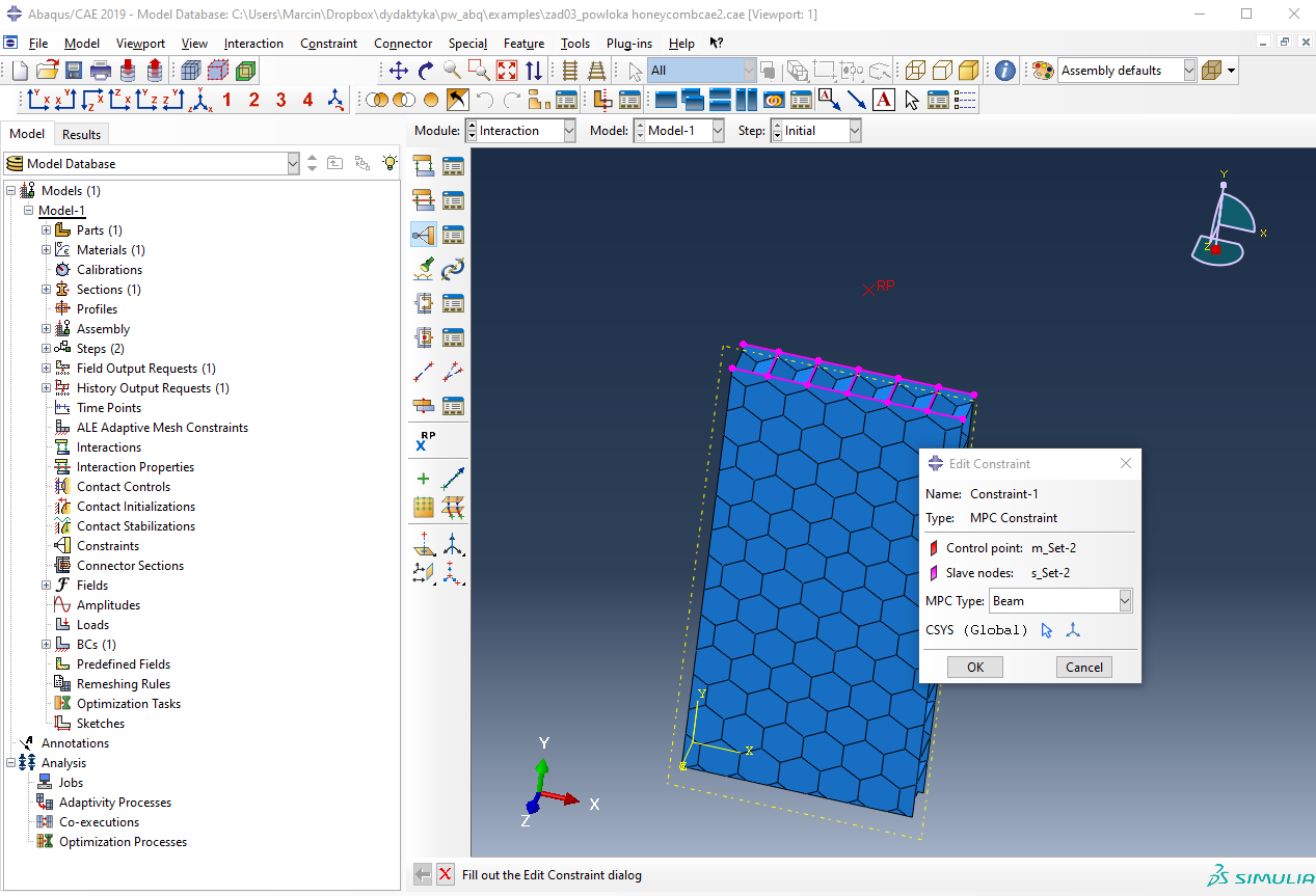 Przechodzimy do modułu "Interaction". Klikamy "Create Constraint". Wybieramy "MPC Constraint" i klikamy "Continue".
